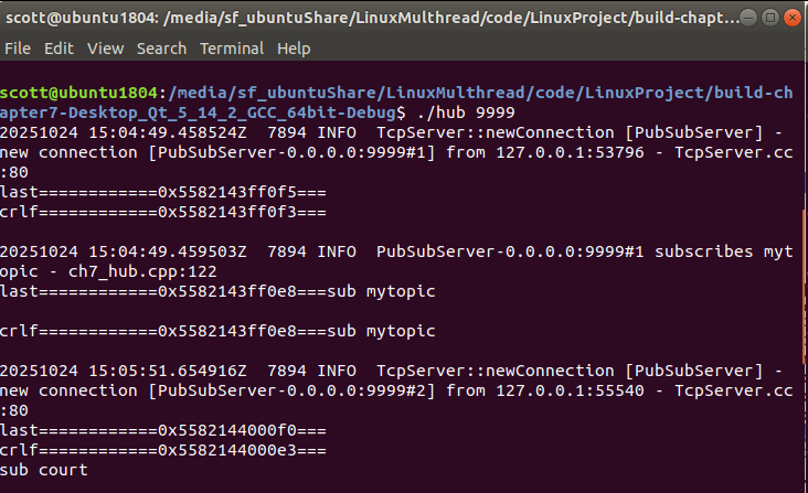 第3个终端执行命令: ./sub 127.0.0.1:9999 mytopic court