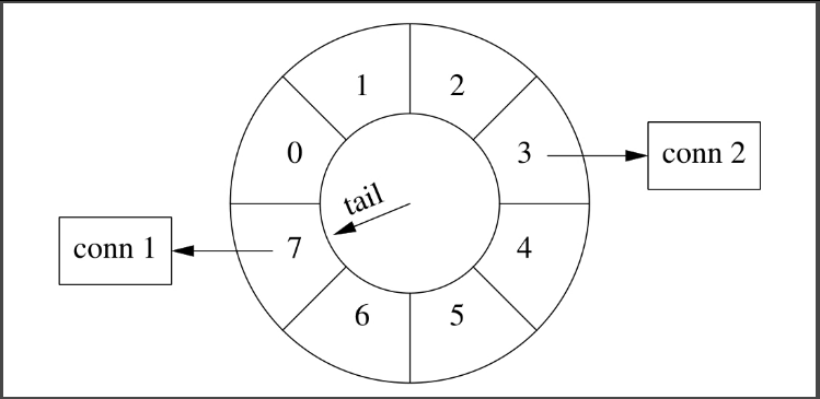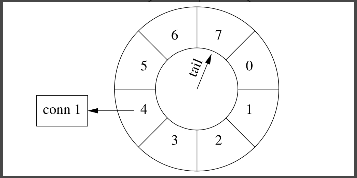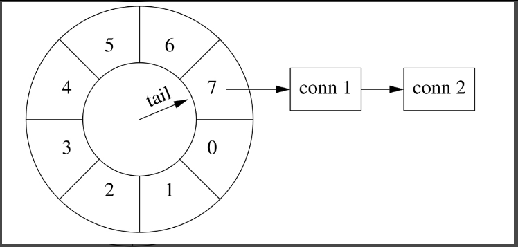 timing wheel中的每个格子是个hash set,可以容纳不止一个连接。比如一开始,conn 1到达。随后,conn 2到达(见图7-47),这时候tail还没有移动,两个连接位于同一个格子中,具有相同的剩余寿命。(在图7-47中画成链表,代码中是哈希表。)