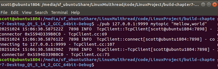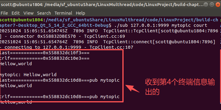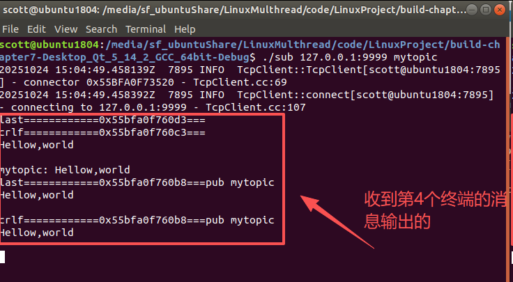 第4个终端执行命令:./pub 127.0.0.1:9999 mytopic "Hellow,world"