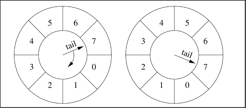 simple timing wheel的基本结构是一个循环队列,还有一个指向队尾的指针(tail),这个指针每秒移动一格,就像钟表上的时针,timing wheel由此得名。