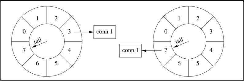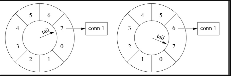 假设在某个时刻,conn 1到达,把它放到当前格子中,它的剩余寿命是7秒(见图7-43的左图)。此后conn 1上没有收到数据。1秒之后(见图7-43的右图),tail指向下一个格子,conn 1的剩余寿命是6秒。