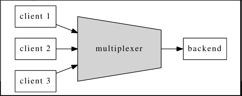 multiplexer的功能需求不复杂,无非是在backend connection和client connec-tions之间倒腾数据。对每个新client connection分配一个新的整数id,如果id用完了,则断开新连接(这样通过控制id的数目就能控制最大连接数)。另外,为了避免id过快地被复用(有可能造成backend串话),multiplexer采用queue来管理free id,每次从队列的头部取id,用完之后放回queue的尾部。具体来说,主要是处理四种事件: