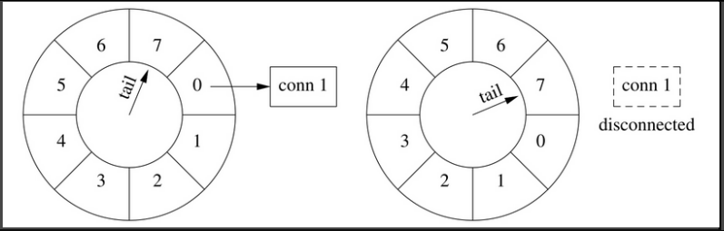 又过了几秒,tail指向conn 1之前的那个格子,conn 1即将被断开(见图7-44的左图)。下一秒(见图7-44的右图),tail重新指向conn 1原来所在的格子,清空其中的数据,断开conn 1连接。