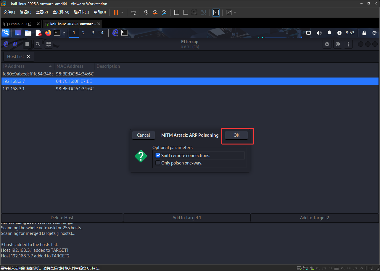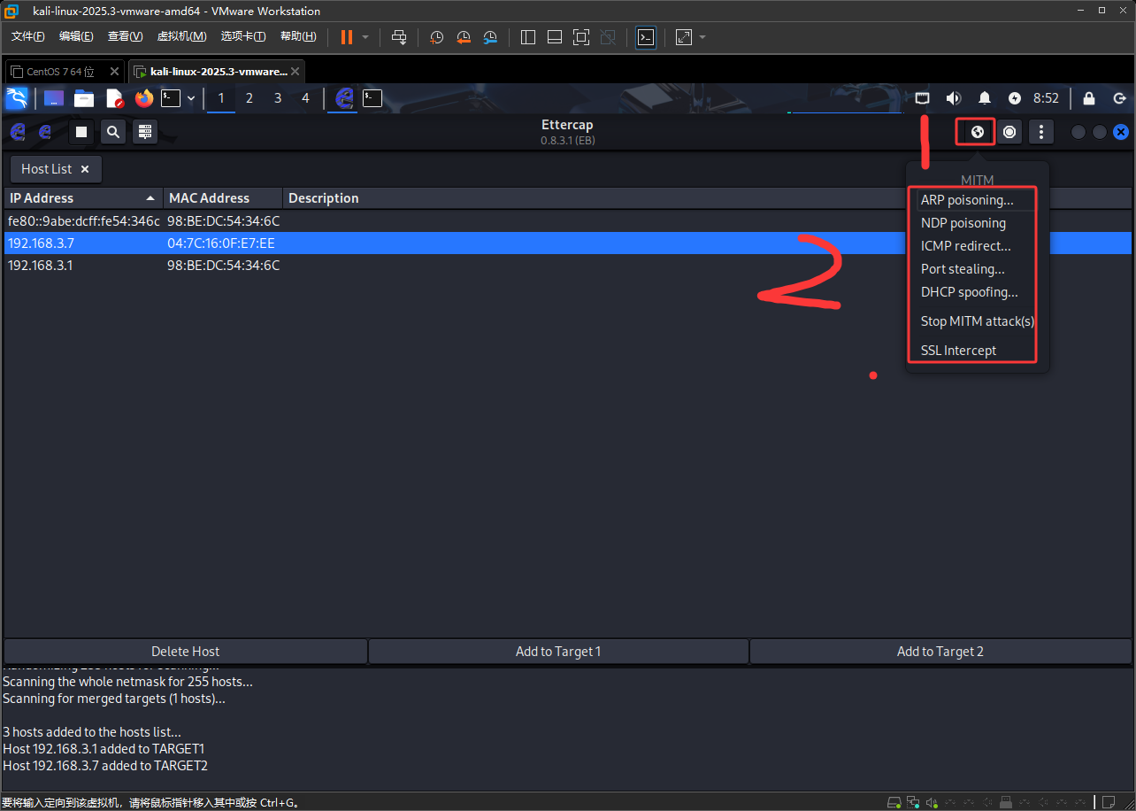 然后点击下图红框,就可以看到可以欺骗的东西了,这里点击ARP poisoning...
