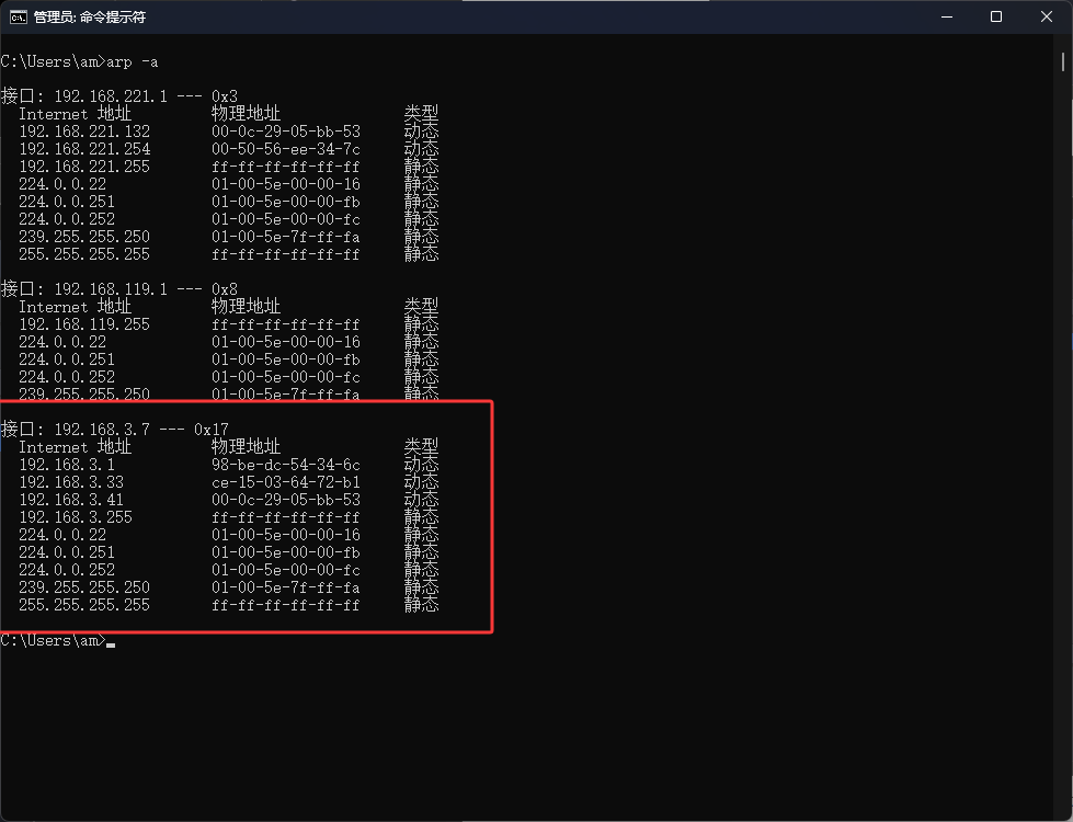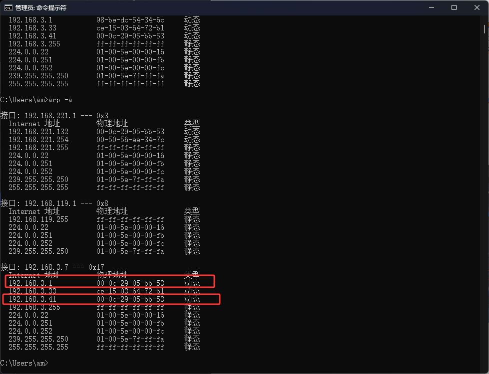 然后来到受害者这边,如下图红框,可以看到网关(192.168.3.1)对应的mac地址变成了192.168.3.41这个电脑的mac地址了,这就说明把受害者进行了arp欺骗,然后就是说受害者做一些事情时流量会转发给我们的Kali中,而不是正常的网关中去,然后当受害者访问了一个网站,然后访问信息会来到Kail中,这时Kail会帮助访问网站,然后把访问到的信息返回给受害者,所以受害者是无感知的