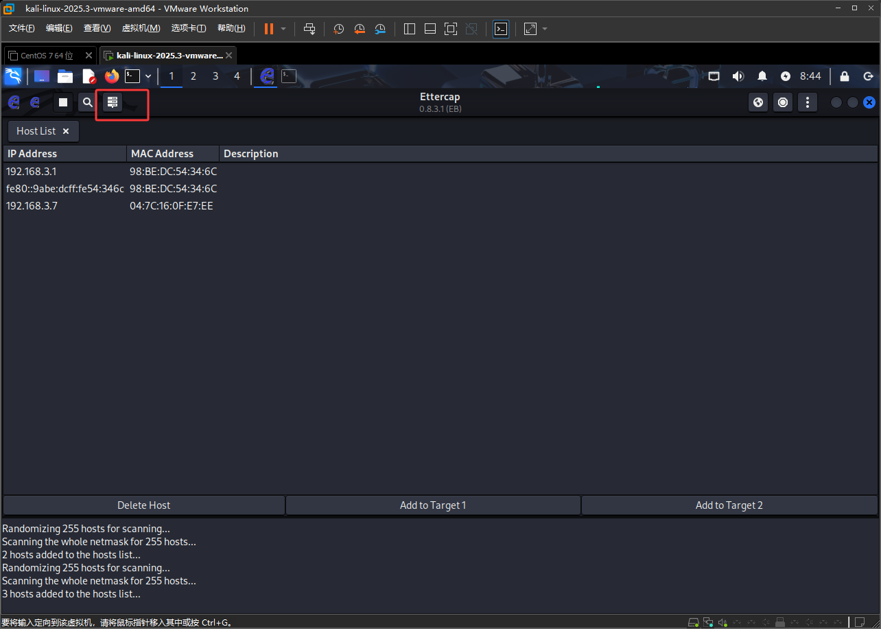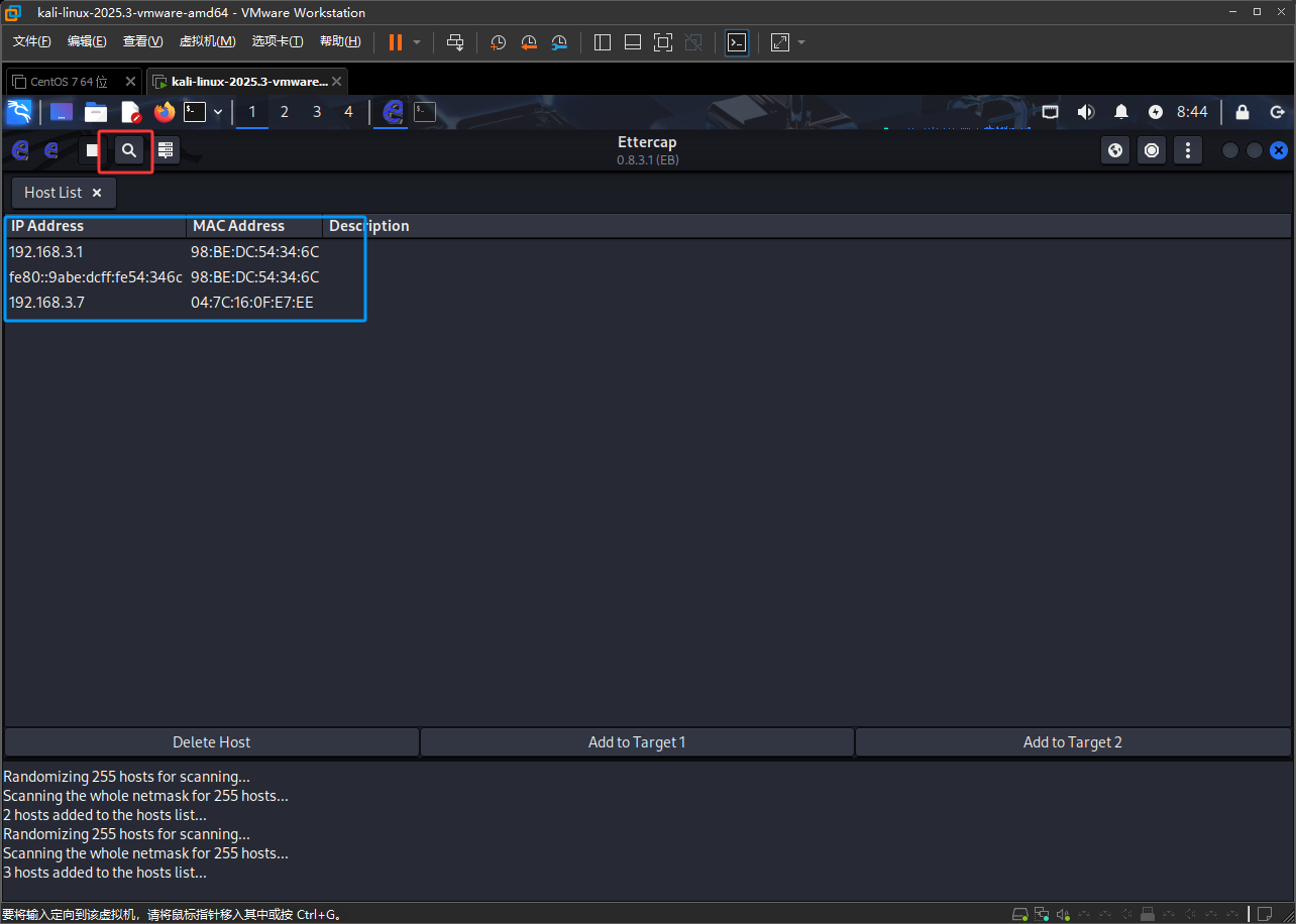 也可以点击下图红框进行扫描,做这个试验最好用真实的Kail Linux电脑,这样比较真实,使用虚拟机不真实,还要和受害者连接同一个局域网,广播数据只会在局域网中发送,出了局域网它是没办法发送的,它也只能扫描到它自己的网段里的设备,也就是只能扫描到192.168.3.0-255这些IP的电脑