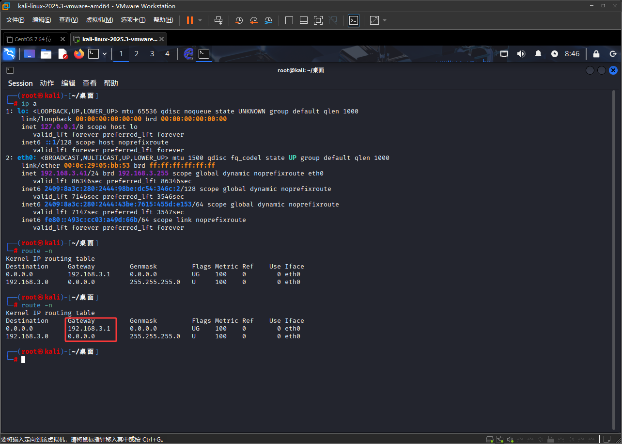 然后接下来去找网关的信息,使用route -n命令,如下图红框,Geteway列就是网关