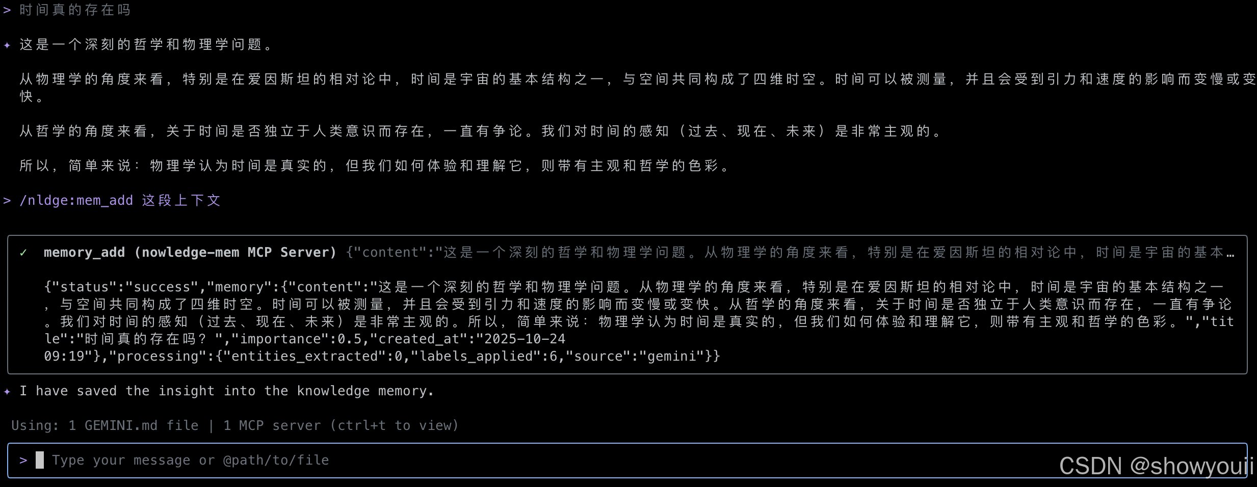 │ ✓ memory_add (nowledge-mem MCP Server) {"content":"这是一个深刻的哲学和物理学问题。从物理学的角度来看,特别是在爱因斯坦的相对论中,时间是宇宙的基本… │