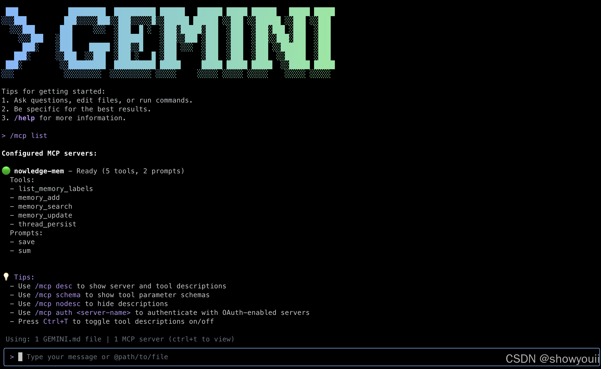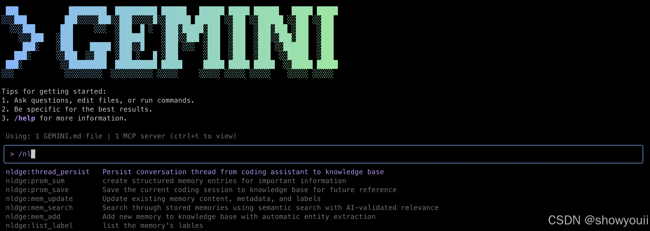 理论说再多,不如亲手一试。平时我需要把我和 gemini-cli 对话的上下文随时保存到 nowledge-mem 中,两者是通过 MCP 服务进行通信,为了不再重复输入相同的 prompt,我把 nowledge-mem 的 MCP 服务提供的功能都封装成了一个个简短的命令行。