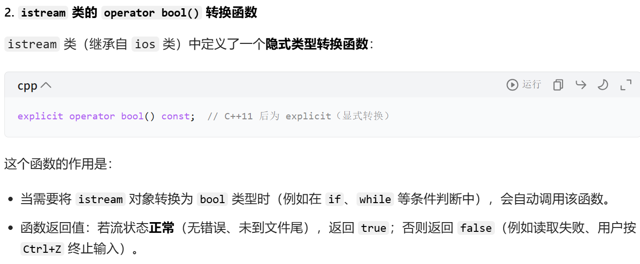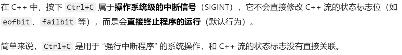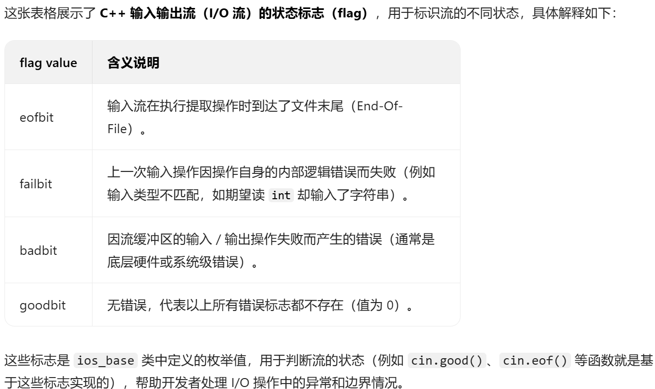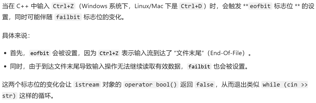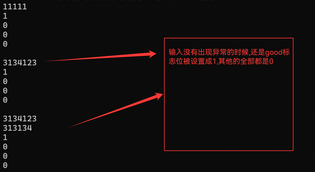 {while (operator>>(cin, str).operator bool()){cout << cin.good() << endl;cout << cin.eof() << endl;cout << cin.bad() << endl;cout << cin.fail() << endl << endl;cout << str << endl; }cout << cin.good() << endl;cout << cin.eof() << endl;cout << cin.bad() << endl;cout << cin.fail() << endl << endl;// 恢复标志状态cin.clear();while (cin >> str){cout << cin.good() << endl;cout << cin.eof() << endl;cout << cin.bad() << endl;cout << cin.fail() << endl << endl;cout << str << endl;}return 0;