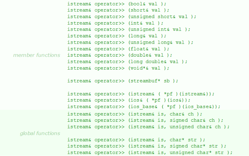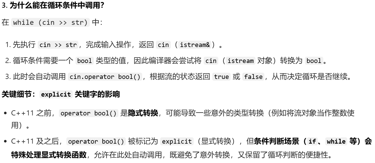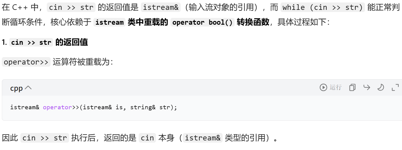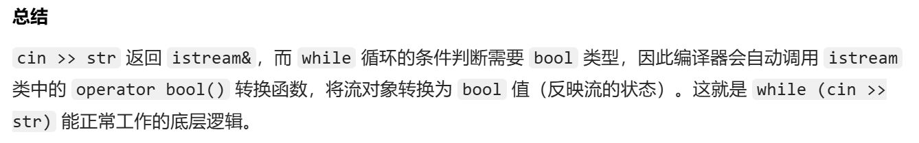 {// istream& operator>> (istream& is, string& str);//while (cin >> str)while (operator>>(cin, str).operator bool()){cout << cin.good() << endl;cout << cin.eof() << endl;cout << cin.bad() << endl;cout << cin.fail() << endl << endl;cout << str << endl; }return 0;