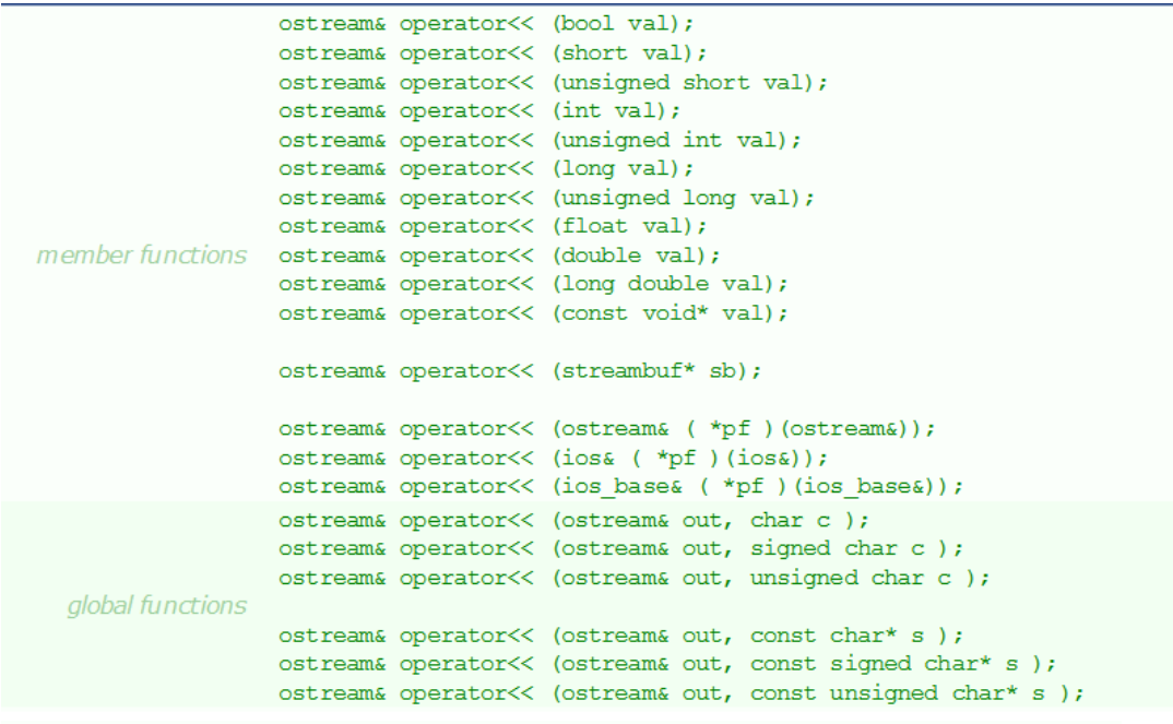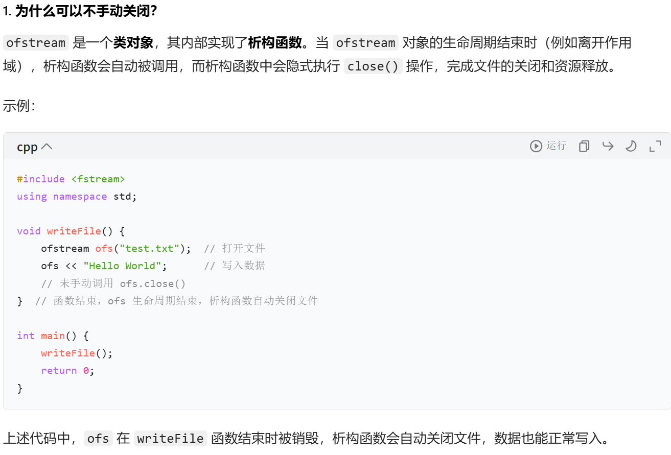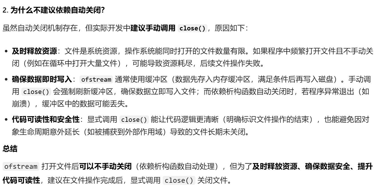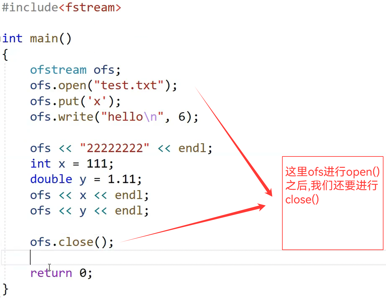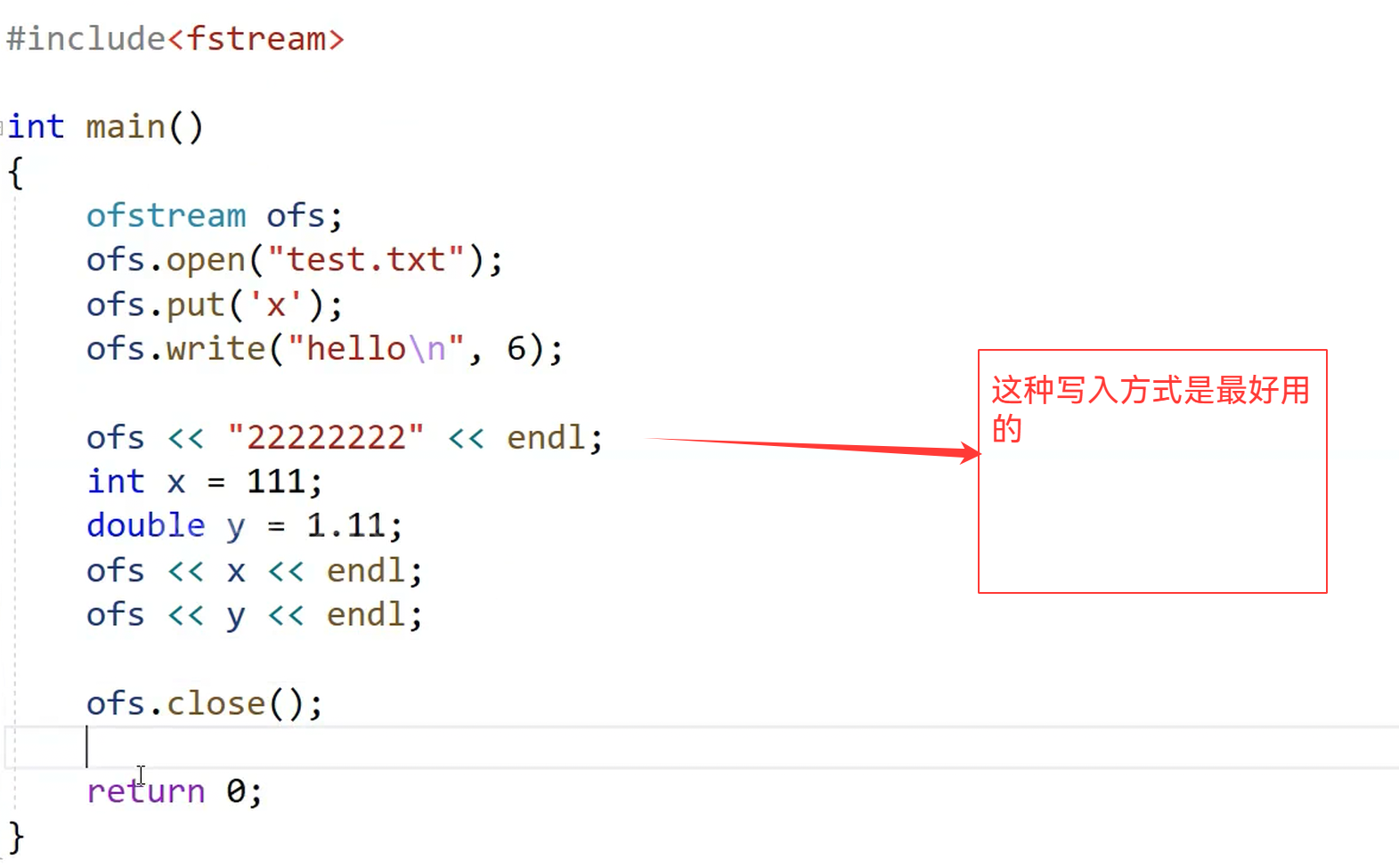 {ofstream ofs("test.txt");//ofs.open("test.txt");ofs.put('x');ofs.write("hello\n", 6);ofs << "22222222" << endl;int x = 111;double y = 1.11;ofs << x << endl;ofs << y << endl;//ofs.close();return 0;