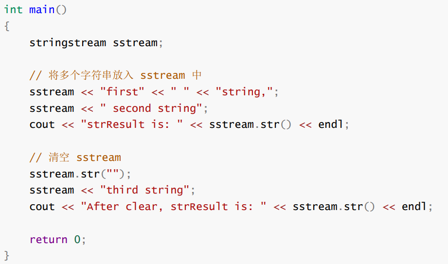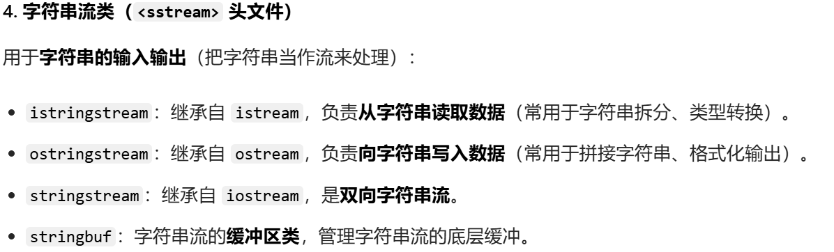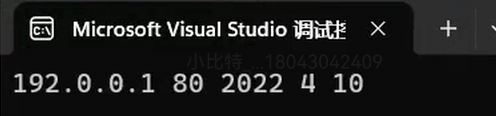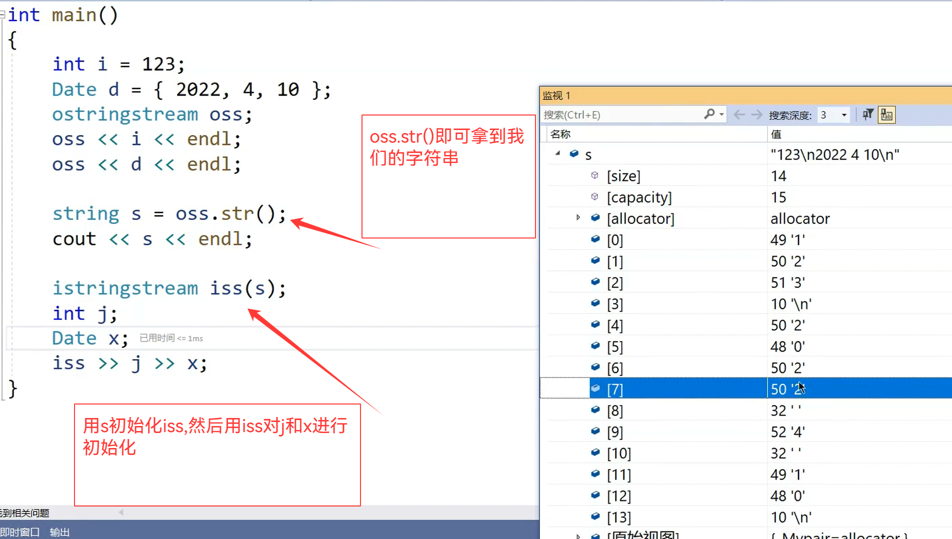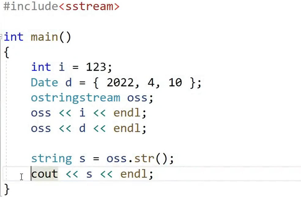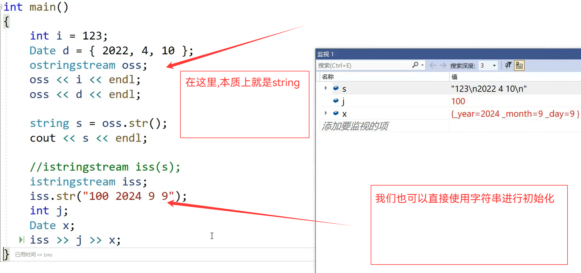 {int i = 123;Date d = { 2022, 4, 10 };ostringstream oss;oss << i << endl;oss << d << endl;string s = oss.str();cout << s << endl;//istringstream iss(s);//istringstream iss;//iss.str("100 2024 9 9");istringstream iss("100 2024 9 9");int j;Date x;iss >> j >> x;return 0;