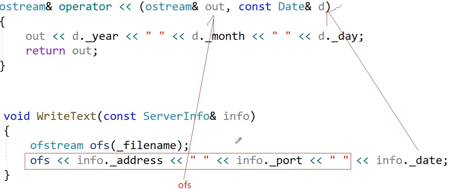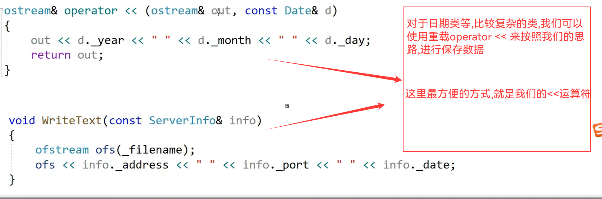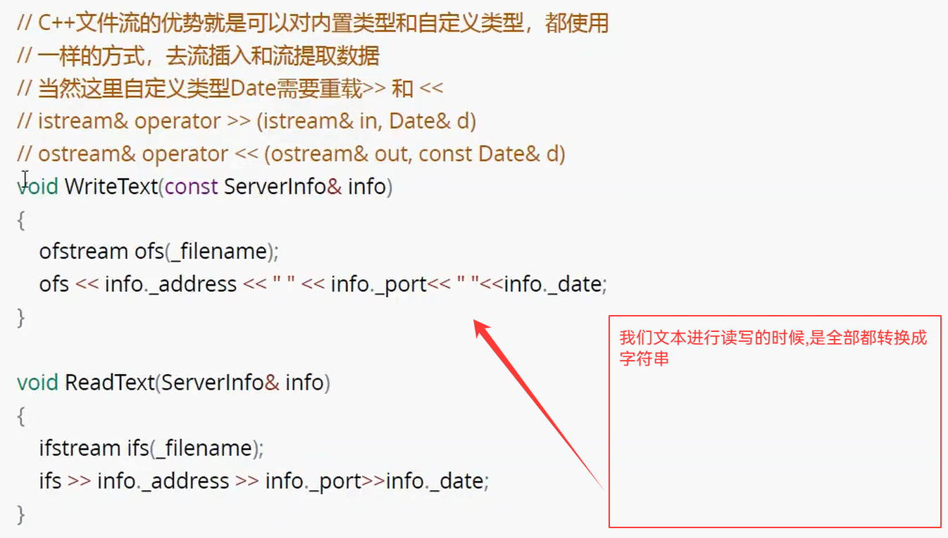 public:ConfigManager(const char* filename):_filename(filename){}// 二进制// 内存中怎么存,囫囵吞枣,怎么写出去void WriteBin(const ServerInfo& info){ofstream ofs(_filename, ios_base::out | ios_base::binary);ofs.write((const char*)&info, sizeof(info));}void ReadBin(ServerInfo& info){ifstream ifs(_filename, ios_base::in | ios_base::binary);ifs.read((char*)&info, sizeof(info));}void WriteText(const ServerInfo& info){ofstream ofs(_filename);ofs << info._address << " " << info._port << " " << info._date;}void ReadText(ServerInfo& info){ifstream ifs(_filename);ifs >> info._address >> info._port >> info._date;}private:string _filename; // 配置文件