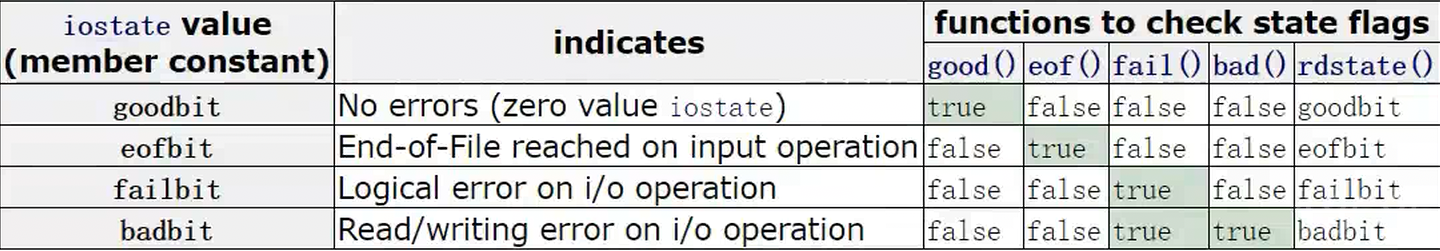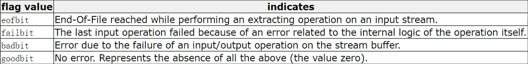 {string str;cout << cin.good() << endl;cout << cin.eof() << endl;cout << cin.bad() << endl;cout << cin.fail() << endl << endl;return 0;