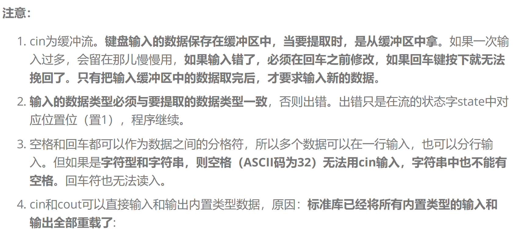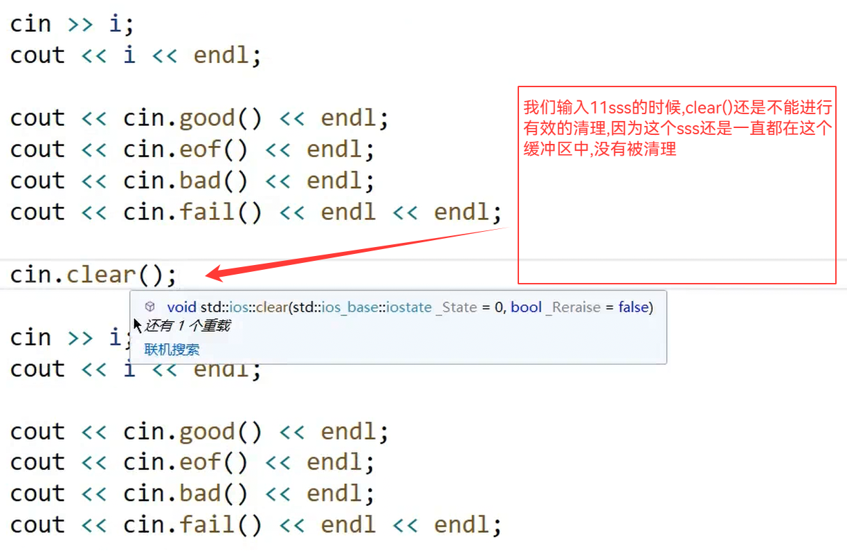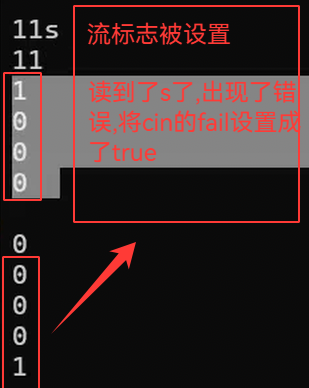 {int i = 0;cout << cin.good() << endl;cout << cin.eof() << endl;cout << cin.bad() << endl;cout << cin.fail() << endl << endl;cin >> i;cout << i << endl;// 11ssscout << cin.good() << endl;cout << cin.eof() << endl;cout << cin.bad() << endl;cout << cin.fail() << endl << endl;cin >> i;cout << i << endl;if (cin.fail()){cin.clear();char ch;while (cin.get(ch)){cout << ch;}}cin >> i;cout << i << endl;cout << cin.good() << endl;cout << cin.eof() << endl;cout << cin.bad() << endl;cout << cin.fail() << endl << endl;return 0;