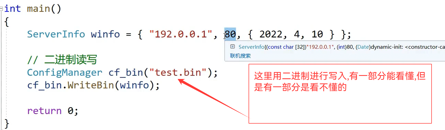 {ServerInfo winfo = { "192.0.0.1111111111111111111111", 80, { 2022, 4, 10 } };// 二进制读写ConfigManager cf_bin("test.bin");cf_bin.WriteBin(winfo);return 0;