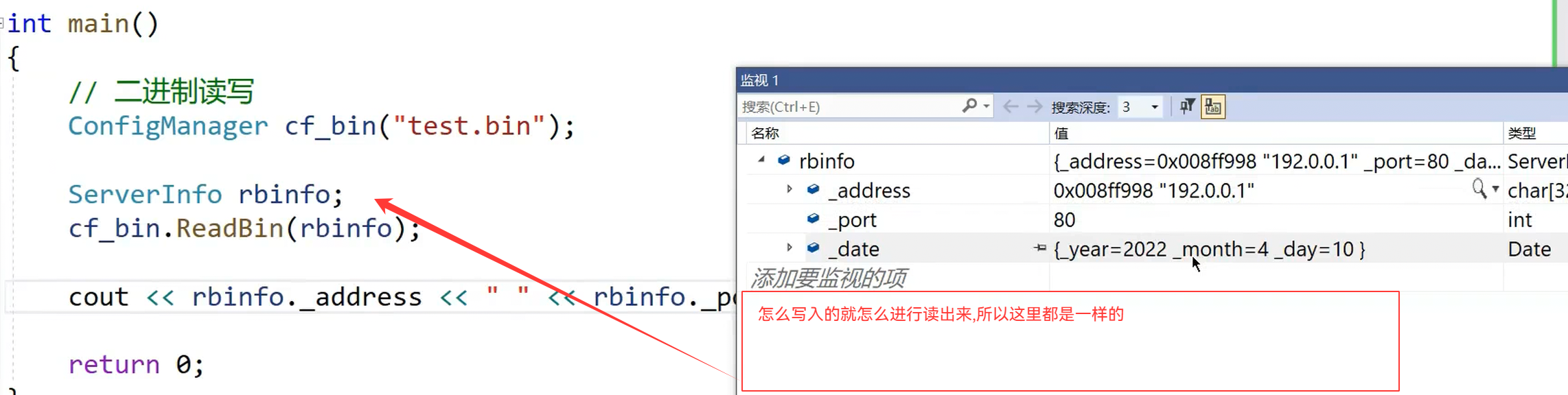 {// 二进制读写ConfigManager cf_bin("test.bin");ServerInfo rbinfo;cf_bin.ReadBin(rbinfo);cout << rbinfo._address << " " << rbinfo._port << " " << rbinfo._date << endl;return 0;
