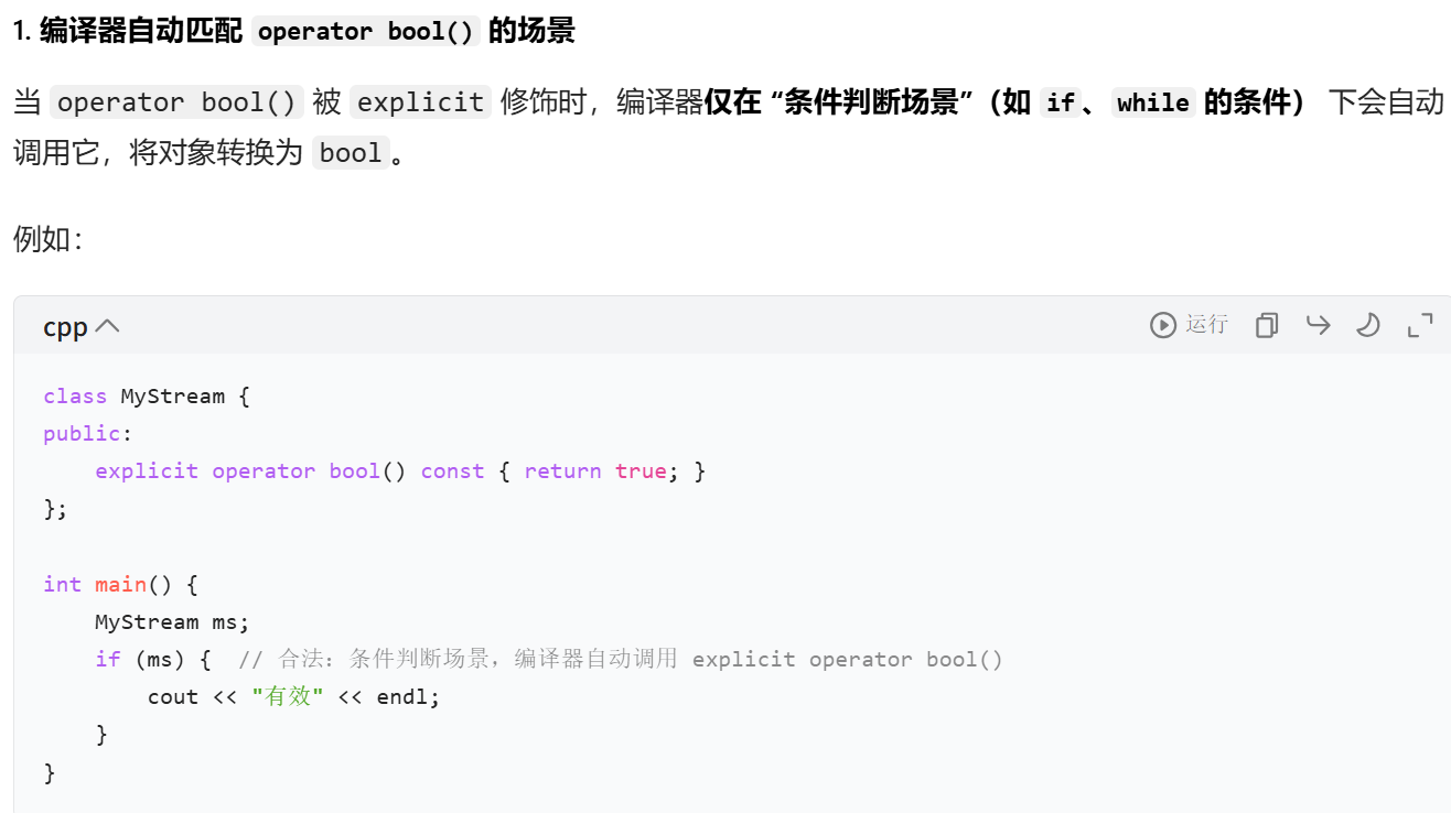 public:Date(int year = 1, int month = 1, int day = 1):_year(year), _month(month), _day(day){}operator bool(){// 这里是随意写的,假设输入_year为0,则结束if (_year == 0)return false;elsereturn true;}