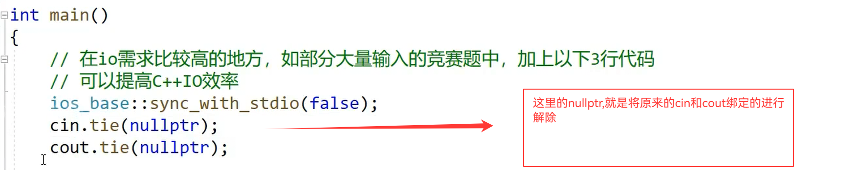 {// 在io需求比较高的地方,如部分大量输入的竞赛题中,加上以下3行代码// 可以提高C++IO效率ios_base::sync_with_stdio(false);cin.tie(nullptr);cout.tie(nullptr);//cout << "31312312";//cin >> i;return 0;