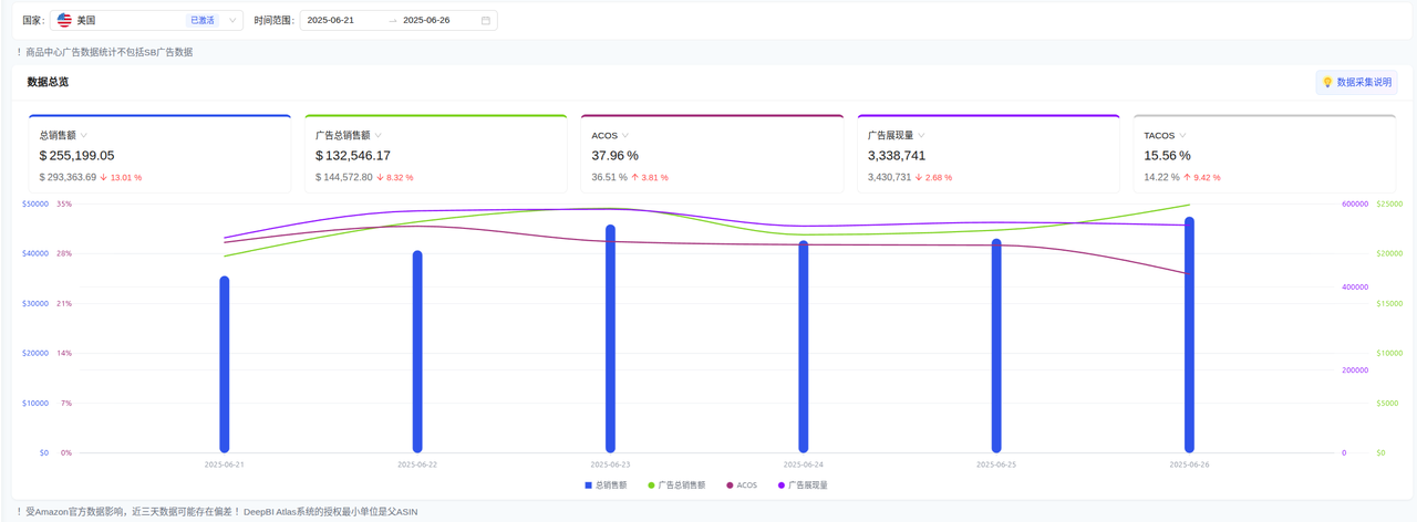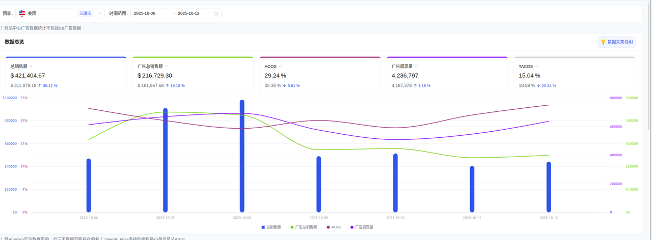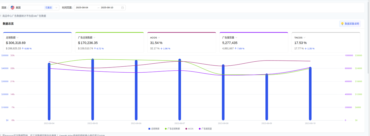 使用DeepBI的第一周,说实话刚开始我还有点担心,毕竟把广告交给AI管理,心里没底。当时我的数据确实很糟糕,销售额连续数周停滞不前,无法突破。