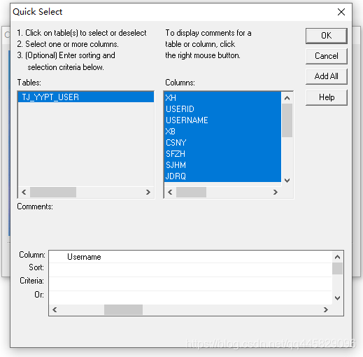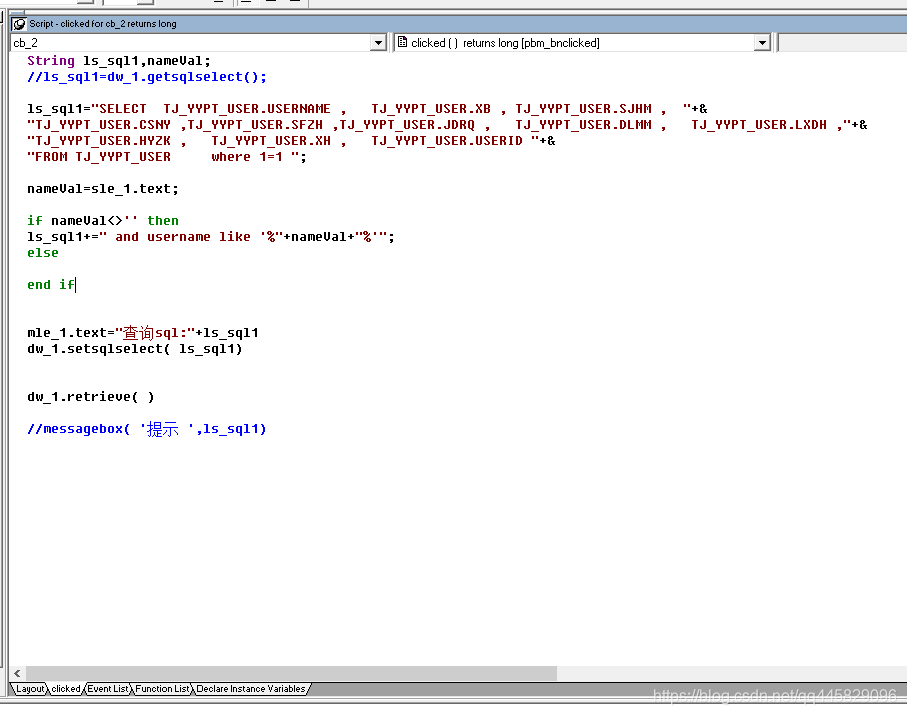 //ls_sql1=dw_1.getsqlselect(); ls_sql1="SELECT TJ_YYPT_USER.USERNAME , TJ_YYPT_USER.XB , TJ_YYPT_USER.SJHM , "+&
