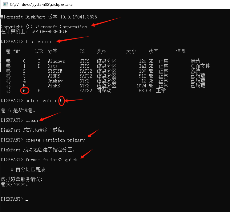 通过diskpart强制格式化报错:虚拟磁盘服务错误:卷大小太大