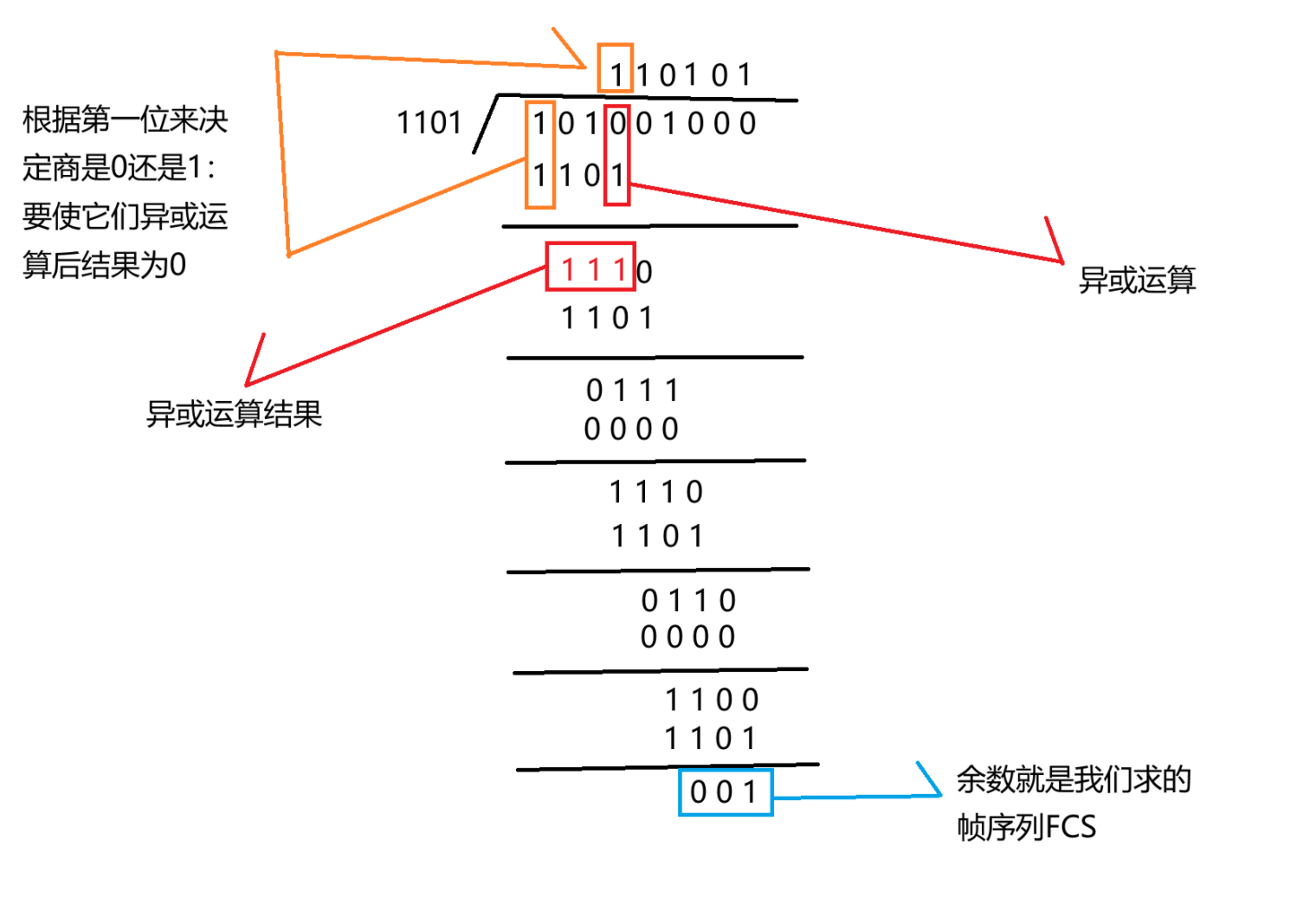所以,求得的帧序列FCS为001(3位,位数与r相同);故CRC码为:101001001(将FCS拼接到原始数据帧后,其作为传输序列,会发送给接收端)。