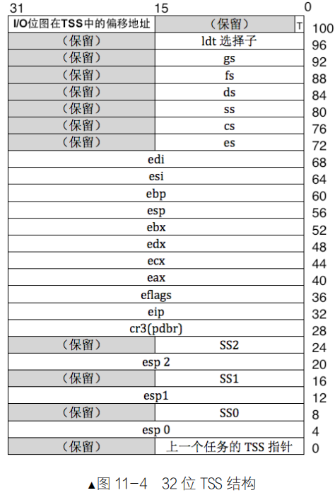 struct tss {uint32_t backlink;uint32_t* esp0;uint32_t ss0;uint32_t* esp1;uint32_t ss1;uint32_t* esp2;uint32_t ss2;uint32_t cr3;uint32_t (*eip) (void);uint32_t eflags;uint32_t eax;uint32_t ecx;uint32_t edx;uint32_t ebx;uint32_t esp;uint32_t ebp;uint32_t esi;uint32_t edi;uint32_t es;uint32_t cs;uint32_t ss;uint32_t ds;uint32_t fs;uint32_t gs;uint32_t ldt;uint16_t trace;uint16_t io_base;