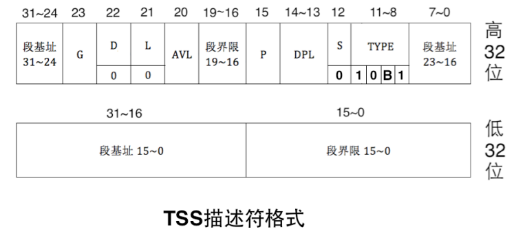#define TSS_DESC_D 0 //这个D/B位在其他段描述中用于表示操作数的大小,但这里不是,实际上它根本就没有被使用(总是设置为0)。//这是因为TSS的大小和结构并不依赖于处理器运行在16位模式还是32位模式。//无论何时,TSS都包含了32位的寄存器值、32位的线性地址等等,因此没有必要用D/B位来表示操作的大小#define TSS_ATTR_HIGH ((DESC_G_4K << 7) + (TSS_DESC_D << 6) + (DESC_L << 5) + (DESC_AVL << 4) + 0x0) //TSS段描述符高32位高字