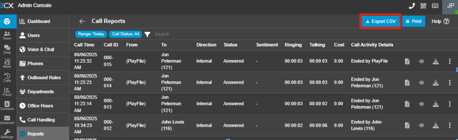 你可以直接从 Update 6 及更高版本的 PBX 报告部分获取通话日志报告 CSV,或设置计划通过电子邮件接收。你可以轻松合并多个 CSV 文件以分析更长时间段。来自 V20 Update 6 发布前和发布后的数据都可以分别或组合导出和使用。