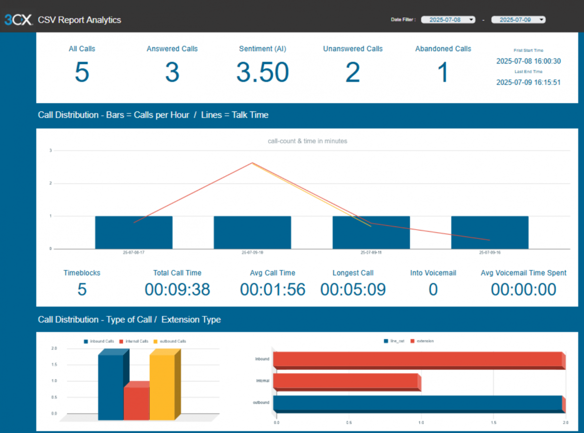 一位 3CX 员工制作了一个原型工具,帮助用户在 Microsoft Excel 或 Google Sheets 中从 PBX 通话日志数据生成可视化报告。正如你所知,CDR 系统已重新编写,以改进数据处理并支持更大规模的部署。对于更大的部署,将数据卸载到外部数据库并使用 Grafana 进行报告,而对于小型安装,Microsoft Excel 或 Google Sheets 模板即可提供足够的分析功能。