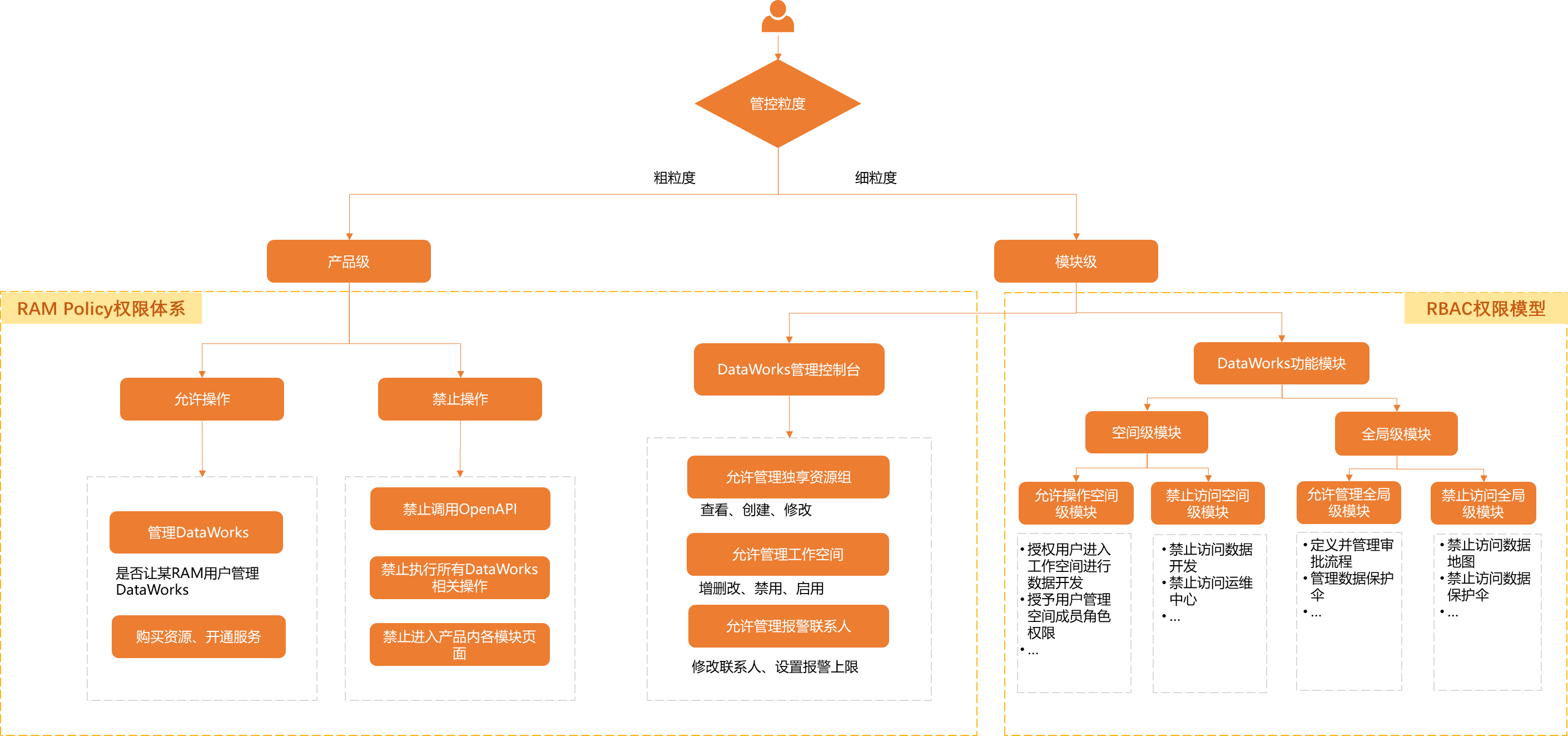 | RBAC权限模型 | 通过为某用户(RAM用户或Role)添加某个角色,这个用户即可拥有此角色包含的DataWorks相关功能模块的使用权限。