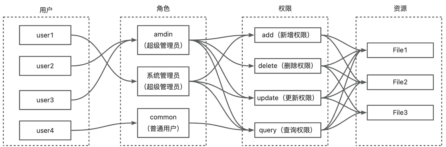 - 角色(Role):权限的集合体,代表特定职责或职能(如“管理员”“编辑”“普通用户”)。