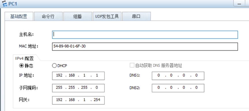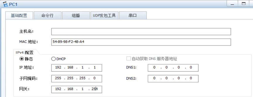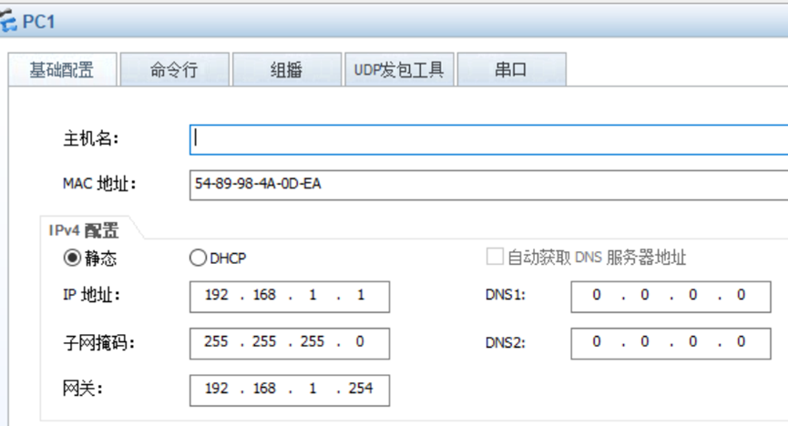 第一步:给PC1-PC4/Server1配置接口IP地址,掩码,网关