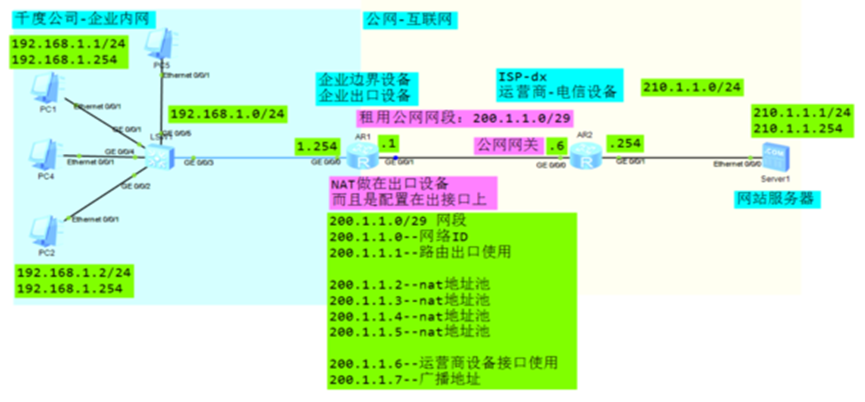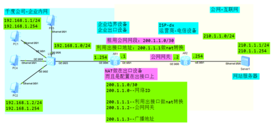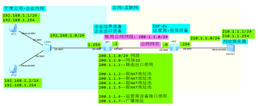 实现企业内网主机(PC1/PC2)访问公网网站服务器(Server1)