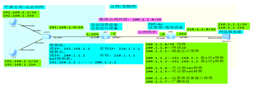 [R1-GigabitEthernet0/0/1]nat static global 200.1.1.2 inside 192.168.1.1 //做出口设备的出接口上配置静态NAT,让公网IP 200.1.1.2 和内网IP 192.168.1.1做1对绑定
