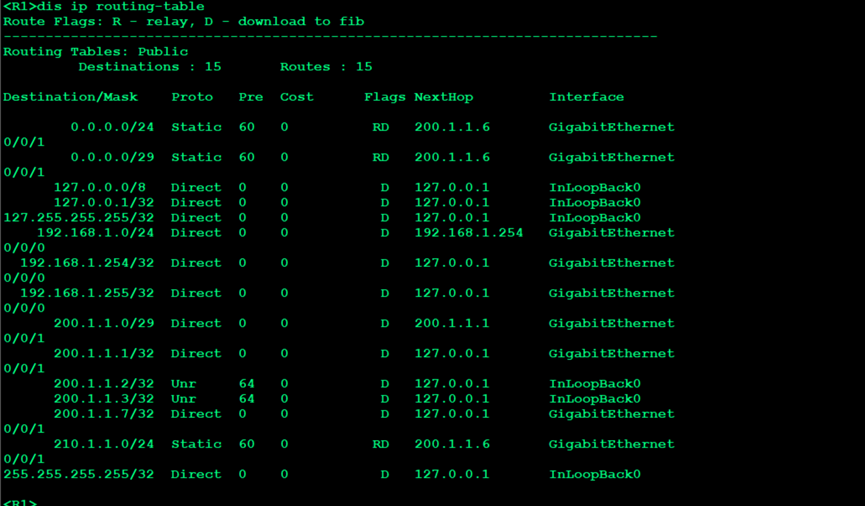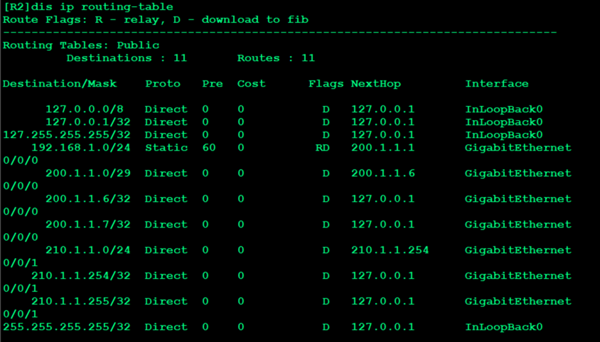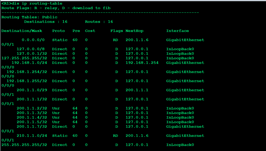 [R1]ip route-static 0.0.0.0 0.0.0.0 200.1.1.6 //配置默认路由,下一跳为公网网关