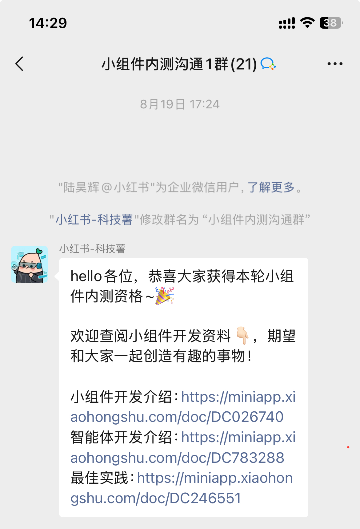 各位好,我们是小组件项目的产品和研发,各位可以先提供下自己的小红书账号,我们为大家添加测试白名单添加后需要完成的事项:1、前往小红书开放平台创建开发者账号(开白后可申请个人主体账号,若已有账号可忽略)