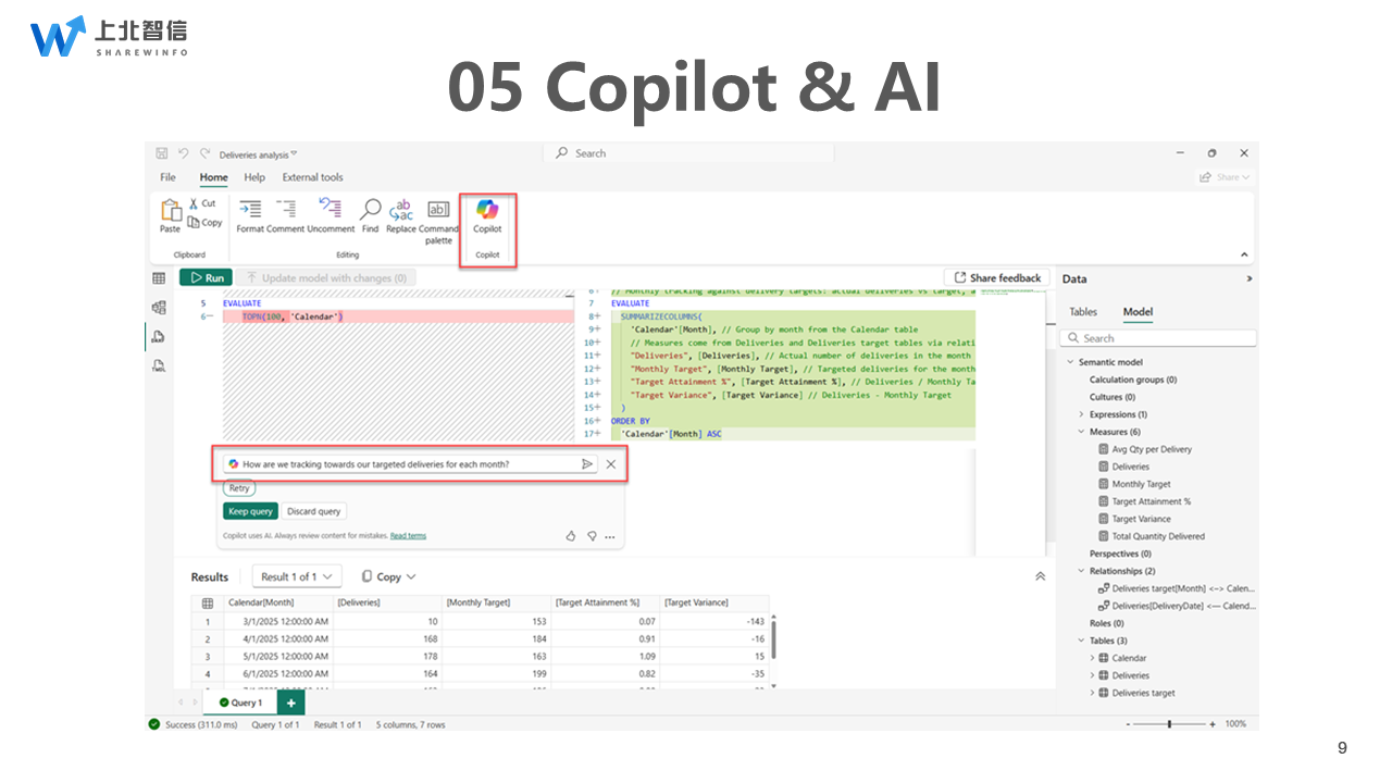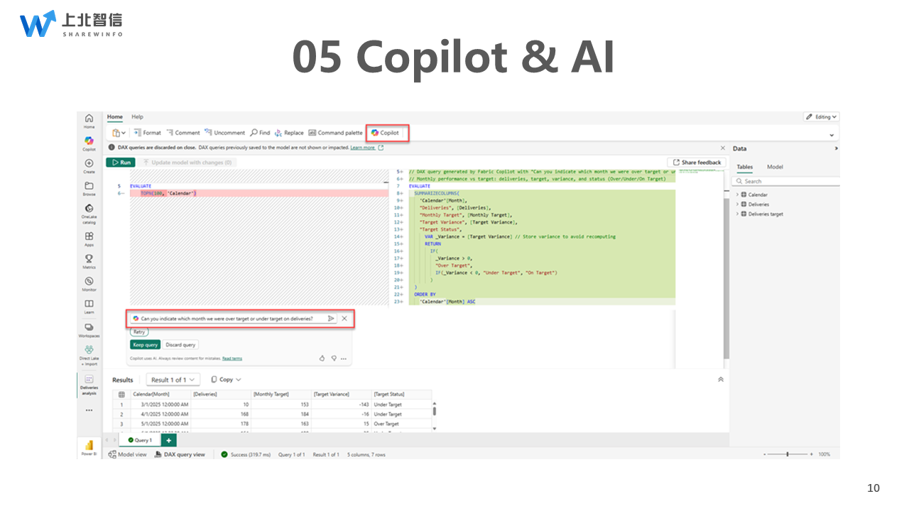 描述:直接说出或写下分析需求,Copilot 会生成 DAX 查询代码。