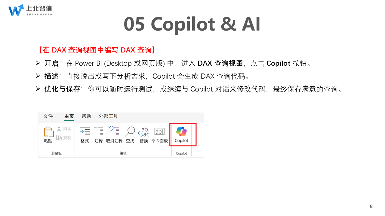 开启:在 Power BI (Desktop 或网页版) 中,进入 DAX 查询视图,点击 Copilot 按钮。