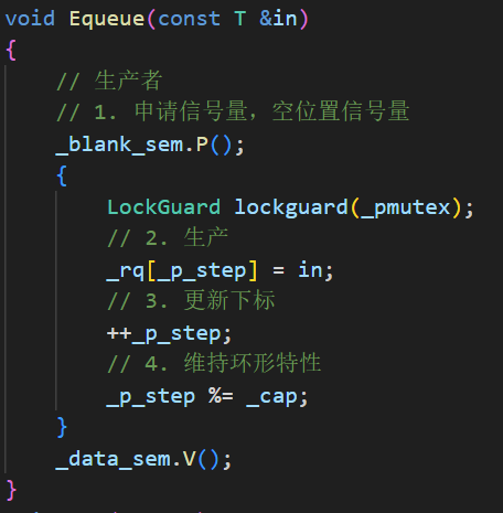 public:RingQueue(int cap = gcap): _cap(cap),_rq(cap),_blank_sem(cap),_p_step(0),_data_sem(0),_c_step(0){}void Equeue(const T &in){// 生产者// 1. 申请信号量,空位置信号量_blank_sem.P();{LockGuard lockguard(_pmutex);// 2. 生产_rq[_p_step] = in;// 3. 更新下标++_p_step;// 4. 维持环形特性_p_step %= _cap;}_data_sem.V();}void Pop(T *out){// 消费者// 1. 申请信号量,数据信号量_data_sem.P();{LockGuard lockguard(_cmutex);// 2. 消费*out = _rq[_c_step];// 3. 更新下标++_c_step;// 4. 维持环形特性_c_step %= _cap;}_blank_sem.V();}private:std::vector<T> _rq;int _cap;// 生产者Sem _blank_sem; // 空位置int _p_step;// 消费者Sem _data_sem; // 数据int _c_step;// 维护多生产,多消费, 2把锁Mutex _cmutex;Mutex _pmutex;