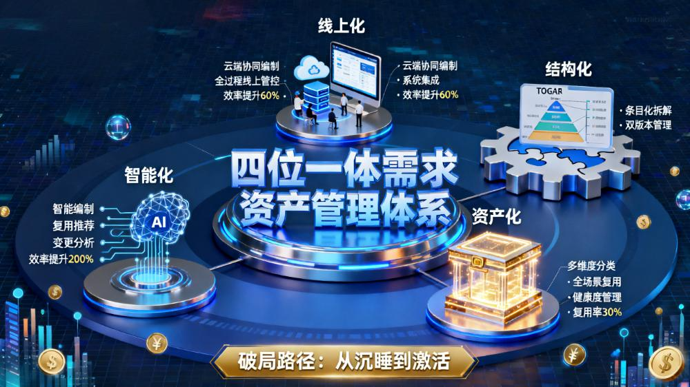 要解决需求资产管理的核心痛点,需从线上化、结构化、资产化、智能化四个维度入手,打造全链路、精细化的管理体系,让需求资产从 “沉睡” 走向 “激活”。