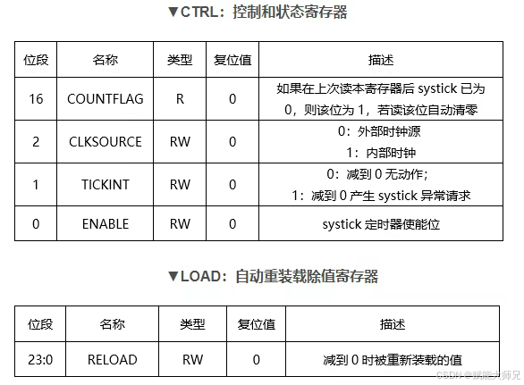SYSTICK的时钟固定为HCLK时钟的1/8,在这里我们选用内部时钟源120M,所以SYSTICK的时钟为(120/8)M,即SYSTICK定时器以(120/8)M的频率递减。SysTick 主要包含CTRL、LOAD、VAL、CALIB 等4 个寄存器。