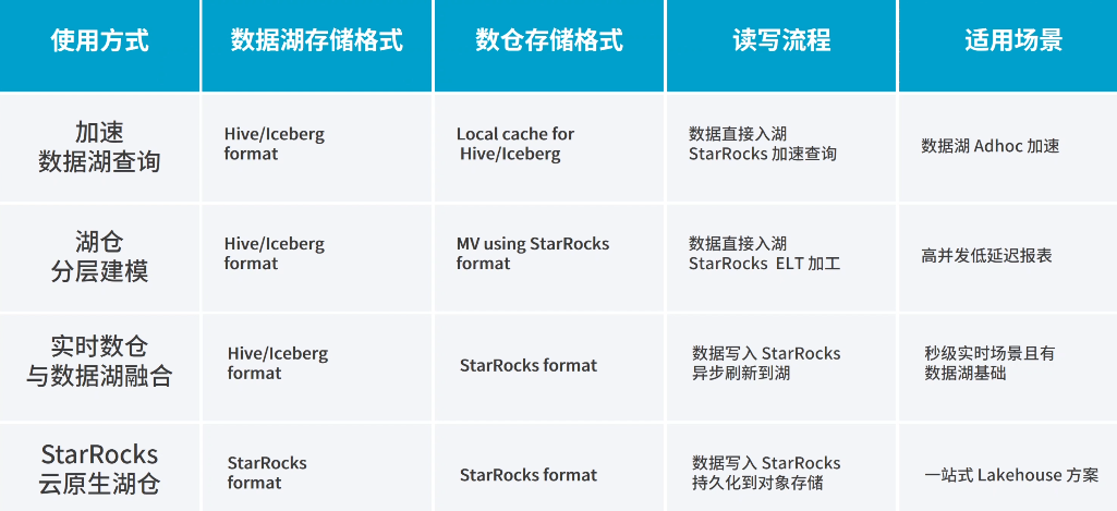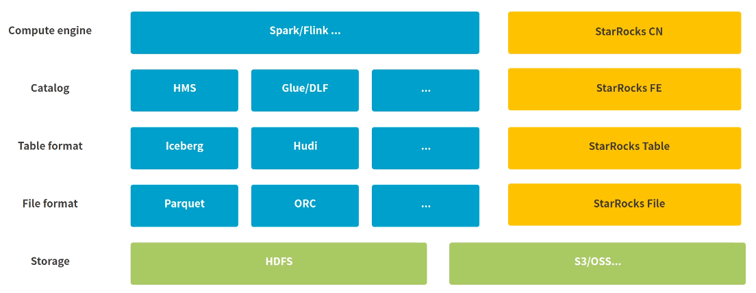 - 对象存储:使用StarRocks自有的文件格式,也可通过外部Catalog直接查询数据湖格式