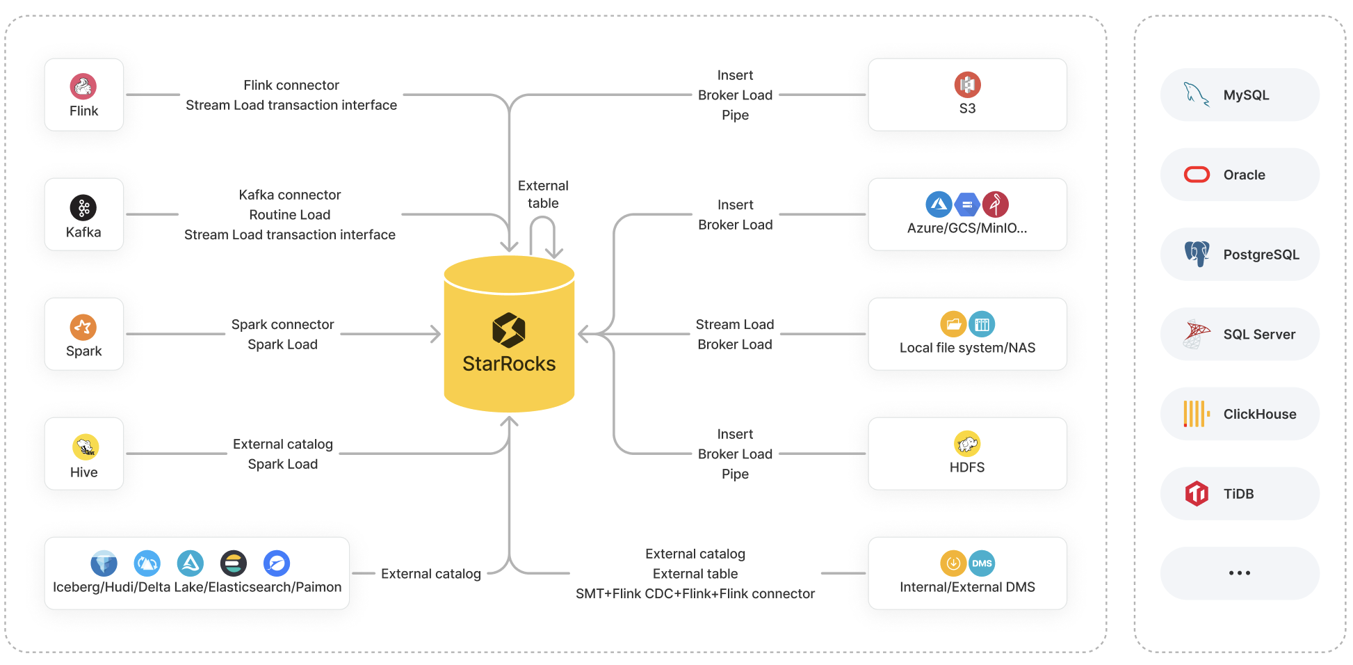 - 联邦查询支持使用统一的StarRocks语法访问MySQL、Oracle等db,Hive、Iceberg、Paimon等datalake,也支持trino方言
