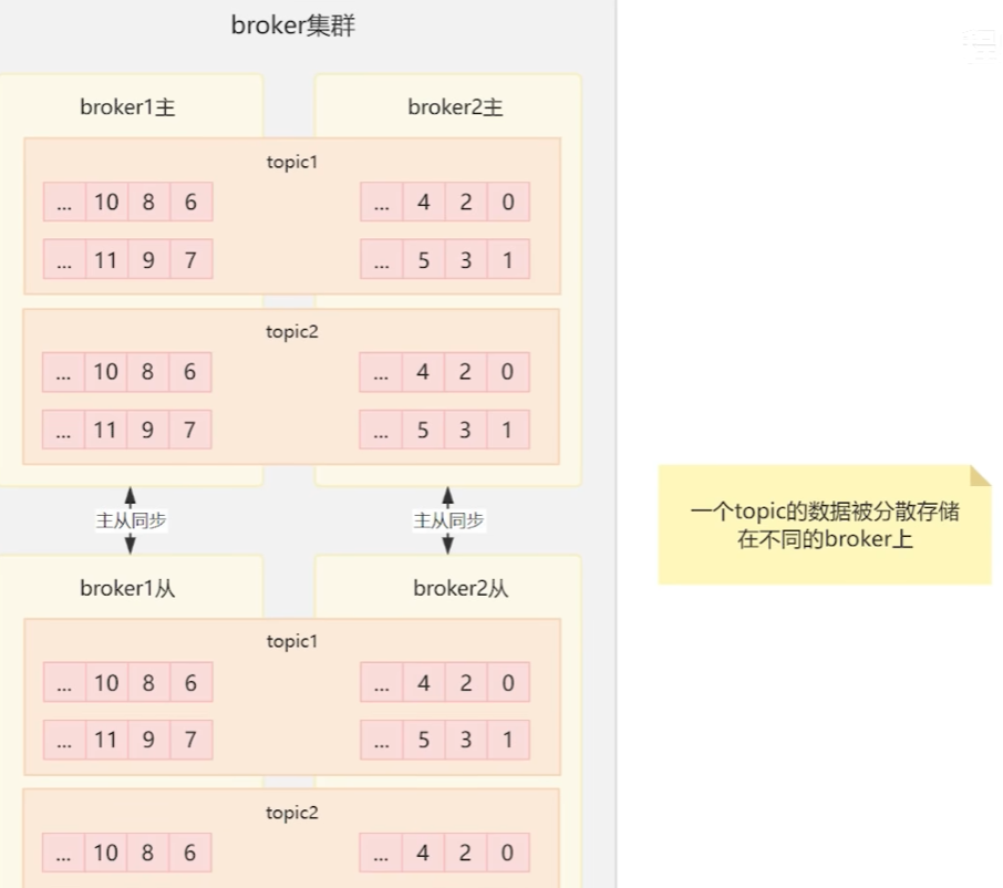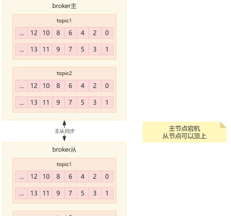 但是mq的设计存在单点故障问题,所以需要做一个主从来解决,这样主节点就单独来做写入,而从节点就单独来做读操作,主节点会将数据逐步写入从节点当中,这样就能有效解决单点故障的问题。