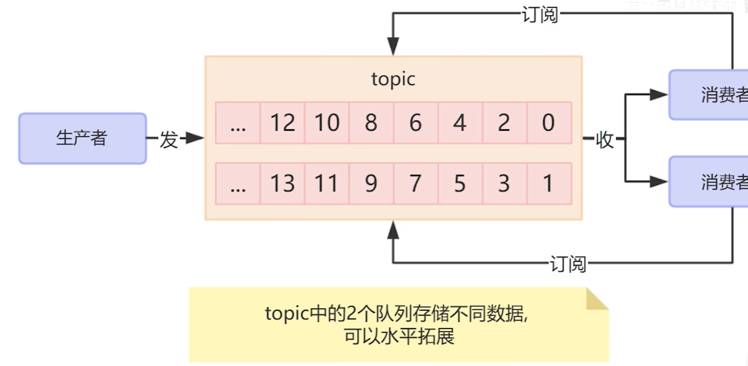 因此我们提供了另一种思路,就是通过消费者去订阅某个主题来解决这种问题,这样消费者就不用强绑定某一个元素了,这样消费者就不再依赖队列,而是通过订阅topic来解决问题,这种模式下,topic还可以存储多个队列,这样队列就可以实现横向拓展了。
