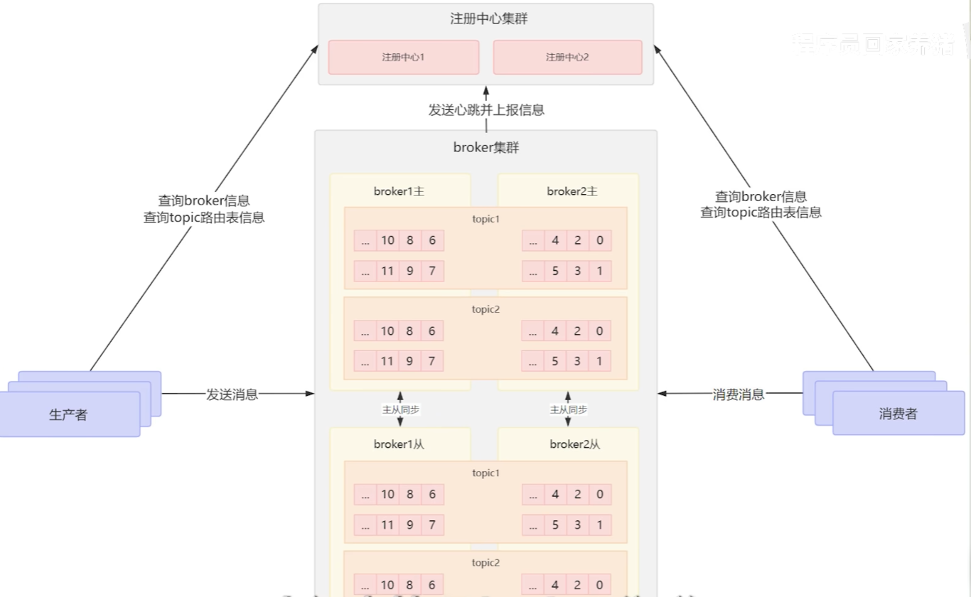 broker集群定时向注册中心去发送心跳包,上报自身的消息,而注册中心获取所有的路由配置,而生产者和消费者通过注册中心得知自己需要从哪个broker中发送和获取消息。