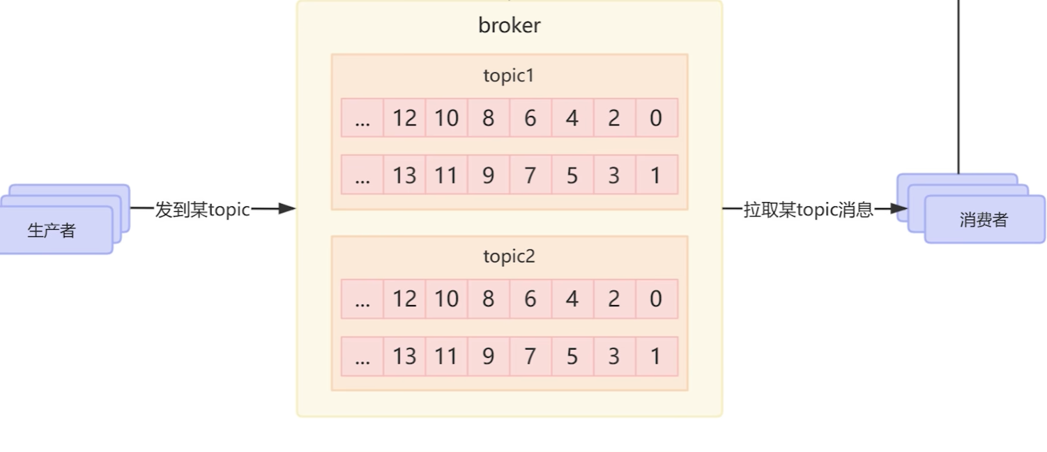 多个topic需要管理,于是统一进行管理,因此mq设计了一个叫做broker的工具来对topic进行管理,生产者的信息就会先存入broker当中,然后传递给消费者,但是这样设计就会导致数据直接存储在内存中,重启后数据就丢失了,所以数据要在磁盘中做持久化。